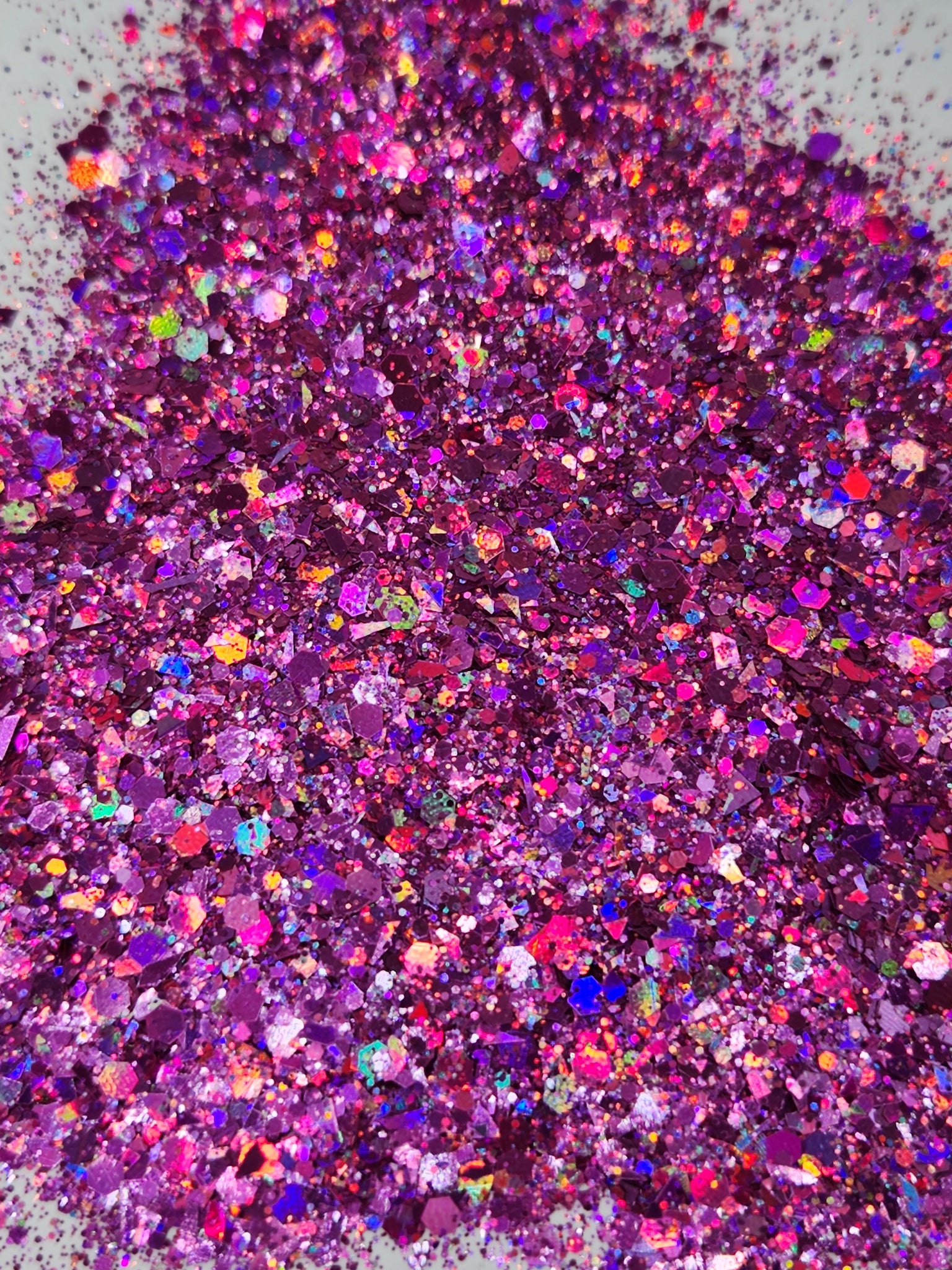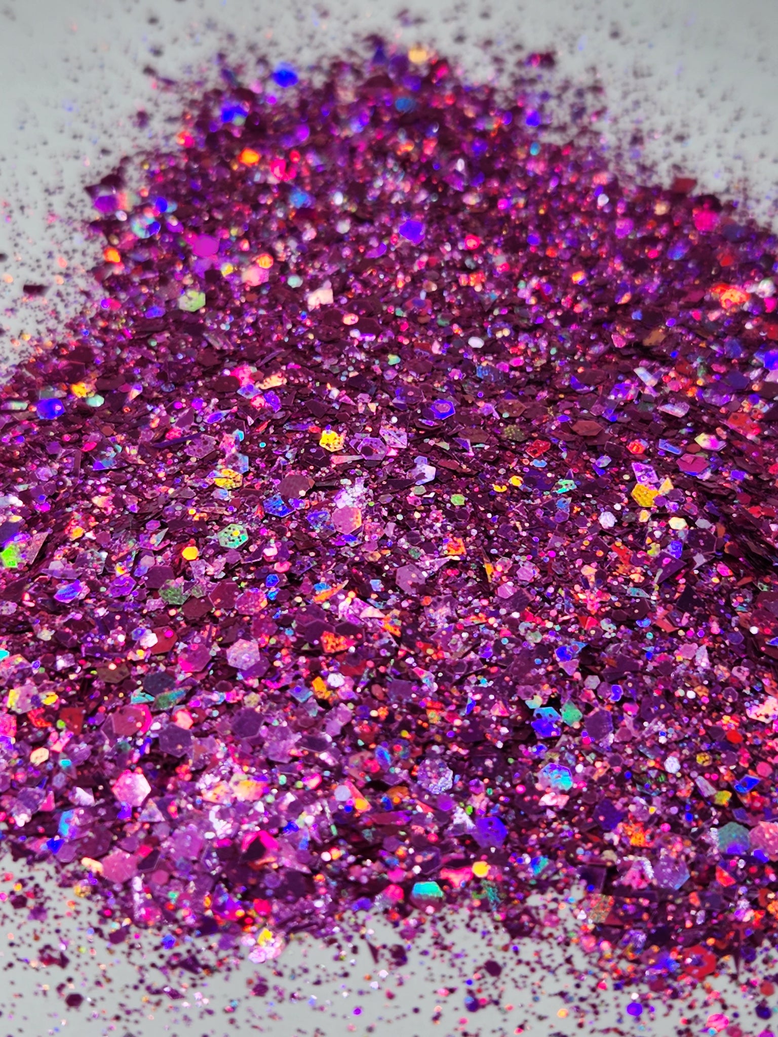 Chunky craft glitter. Glitter that gives off a holographic, shimmery, metallic, and iridescent appearance. Glitters can be used in nail polish, Arts and crafts; tumblers, glass, clay, painting, scrap booking, embossing, furniture. The possibilities are endless.